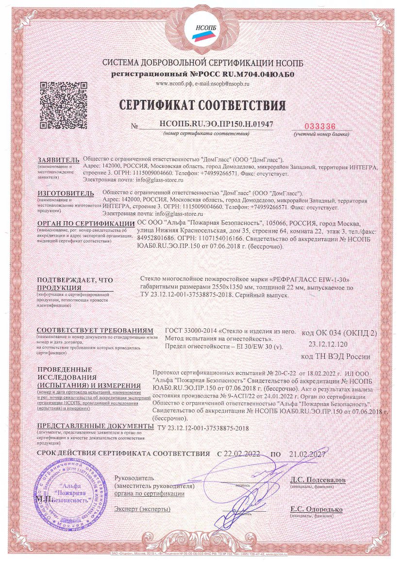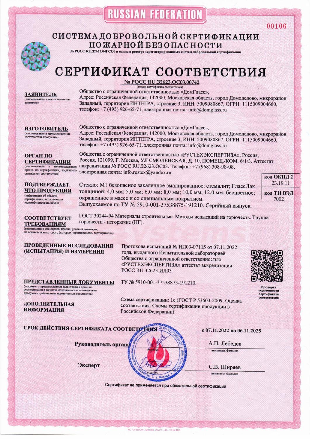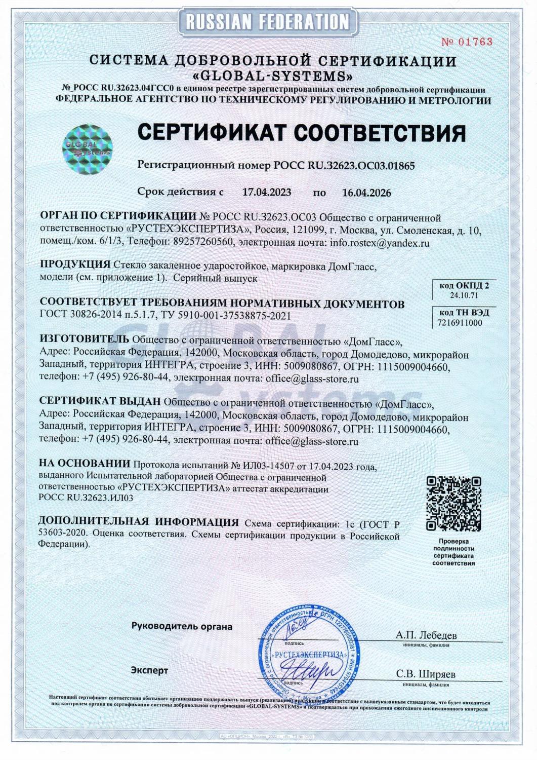 Сертификаты компании DomGlass ООО «ДомГласс» надежный партнер промышленной переработки стекла: закалка, триплекс, стемалит, противопожарное стекло и конструкции.