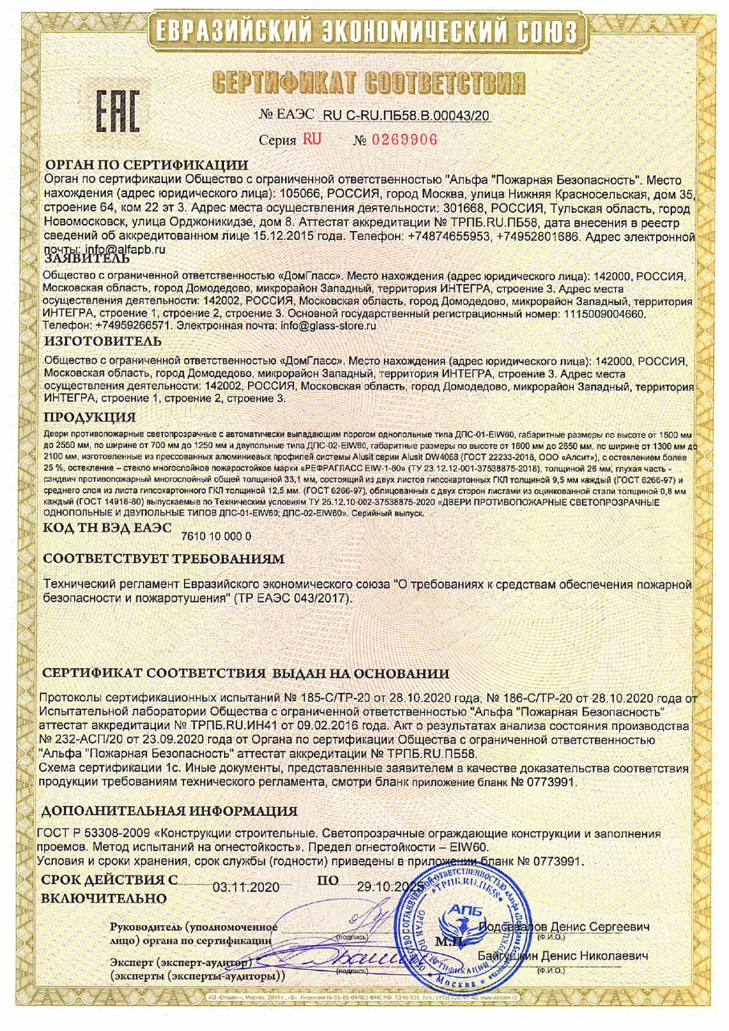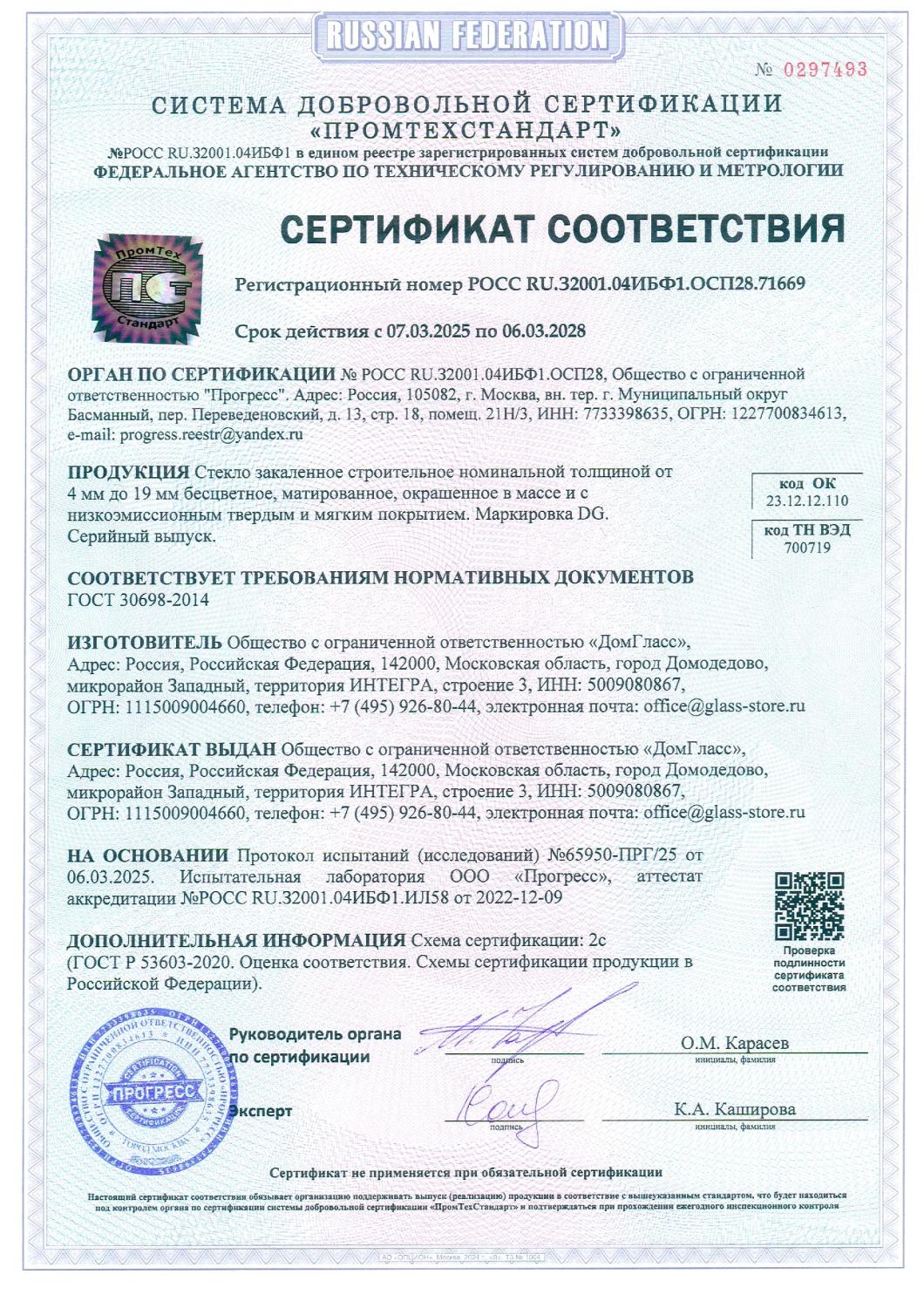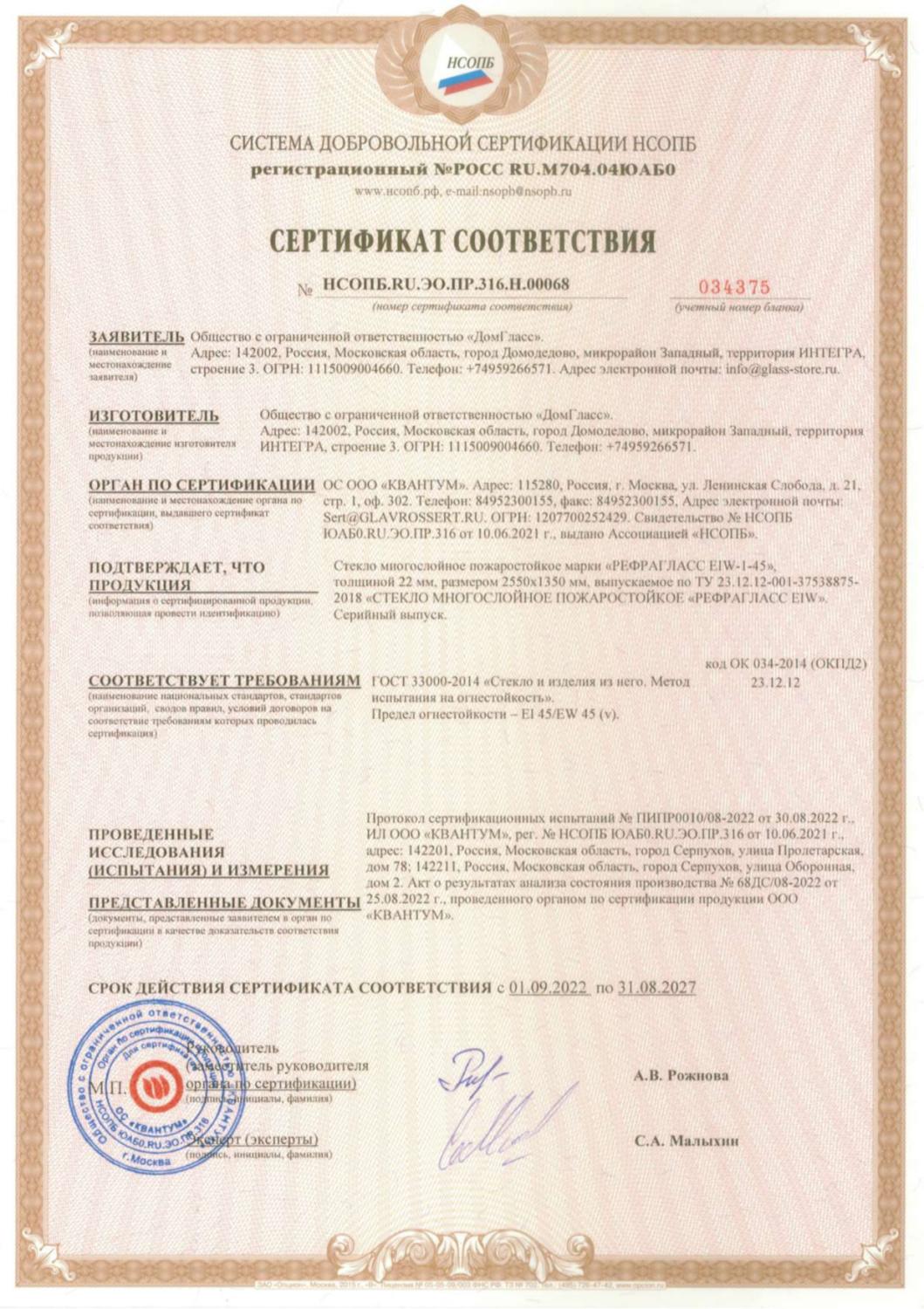 Сертификаты компании DomGlass ООО «ДомГласс» надежный партнер промышленной переработки стекла: закалка, триплекс, стемалит, противопожарное стекло и конструкции.