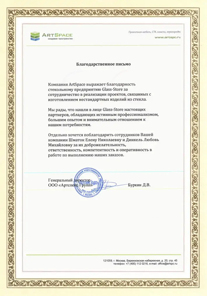 Компания ArtSpace выражает благодарность стекольному предприятию ДомГласс за сотрудничество в реализации проектов, связанных с изготовлением нестандартных изделий из стекла.