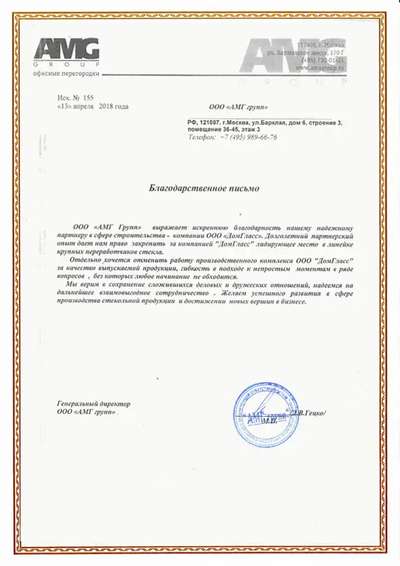 Компания ООО "АМГ Групп" выражает искреннюю благодарность нашему надежному партнеру в сфере строительства - компании ООО "ДомГласс". Долголетний партнерский опыт дает нам право закрепить за компанией ООО "ДомГласс" лидирующее место в линейке крупных переработчиков стекла.