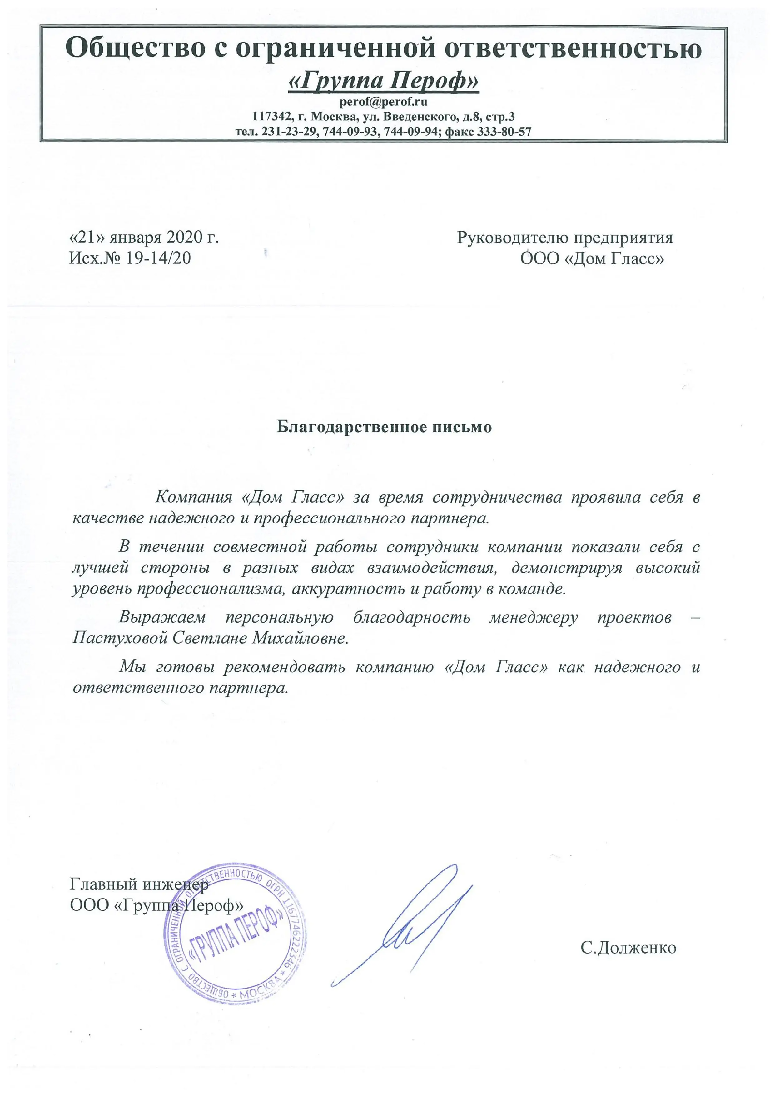 Мы готовы рекомендовать компанию "ДомГласс" как надежного и ответственного партнера.